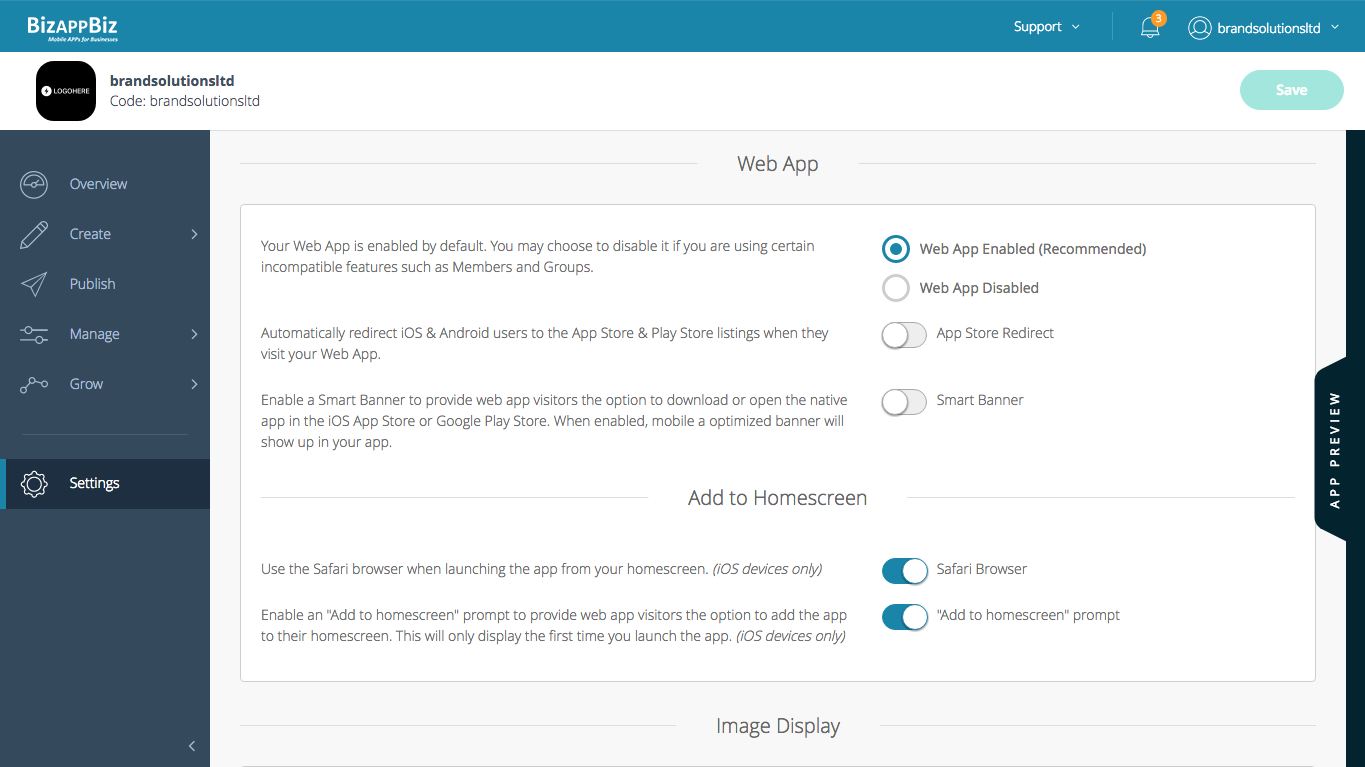 – Smart Banner: This will provide web app visitors the option to download or open the native app in the iOS App Store or Google Play Store. Leave this toggle disabled if you’d like to allow iOS and Android users to view your Web App.